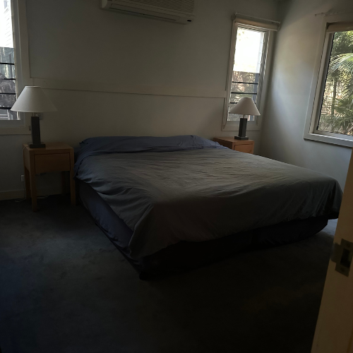 Upstairs Master bedroom with king size bed and built in cupboard.